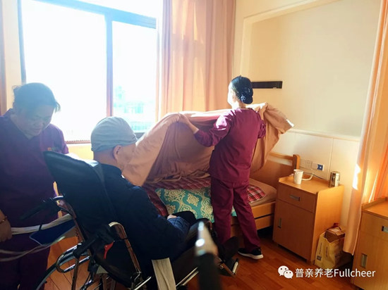 ▲于彩云和同事給剛起床的老人穿衣,整理床鋪,每項工作都有標準化的服務流程。