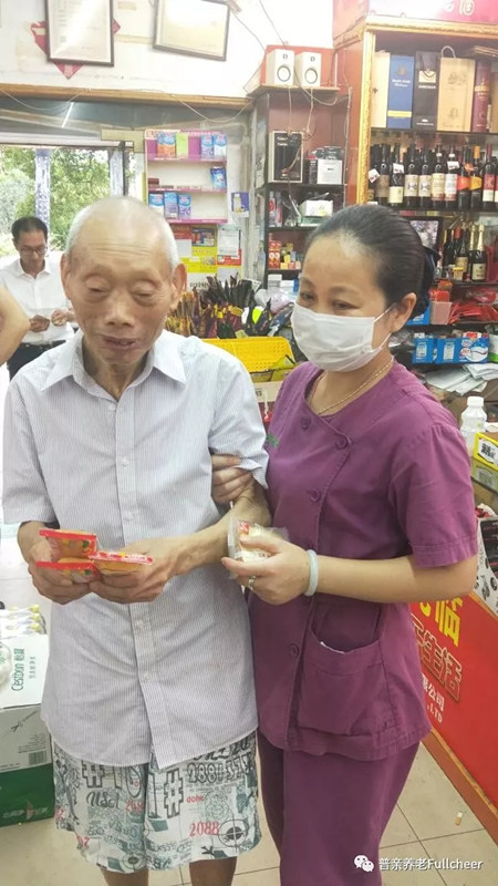▲老人身體條件允許的情況下,符英會陪老人出門逛逛商店,購物成功的老人可開心了。