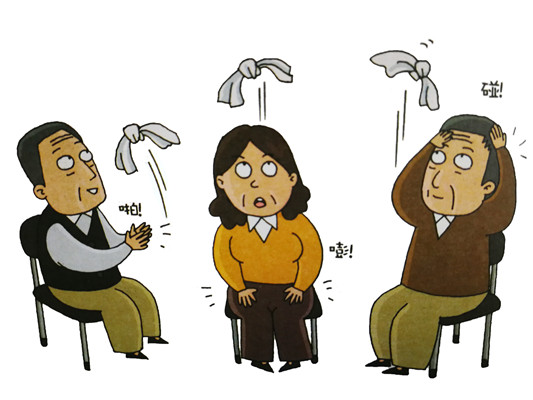 ③將毛巾向上拋擲,用手拍一次后,抓住毛巾讓它不要落地。