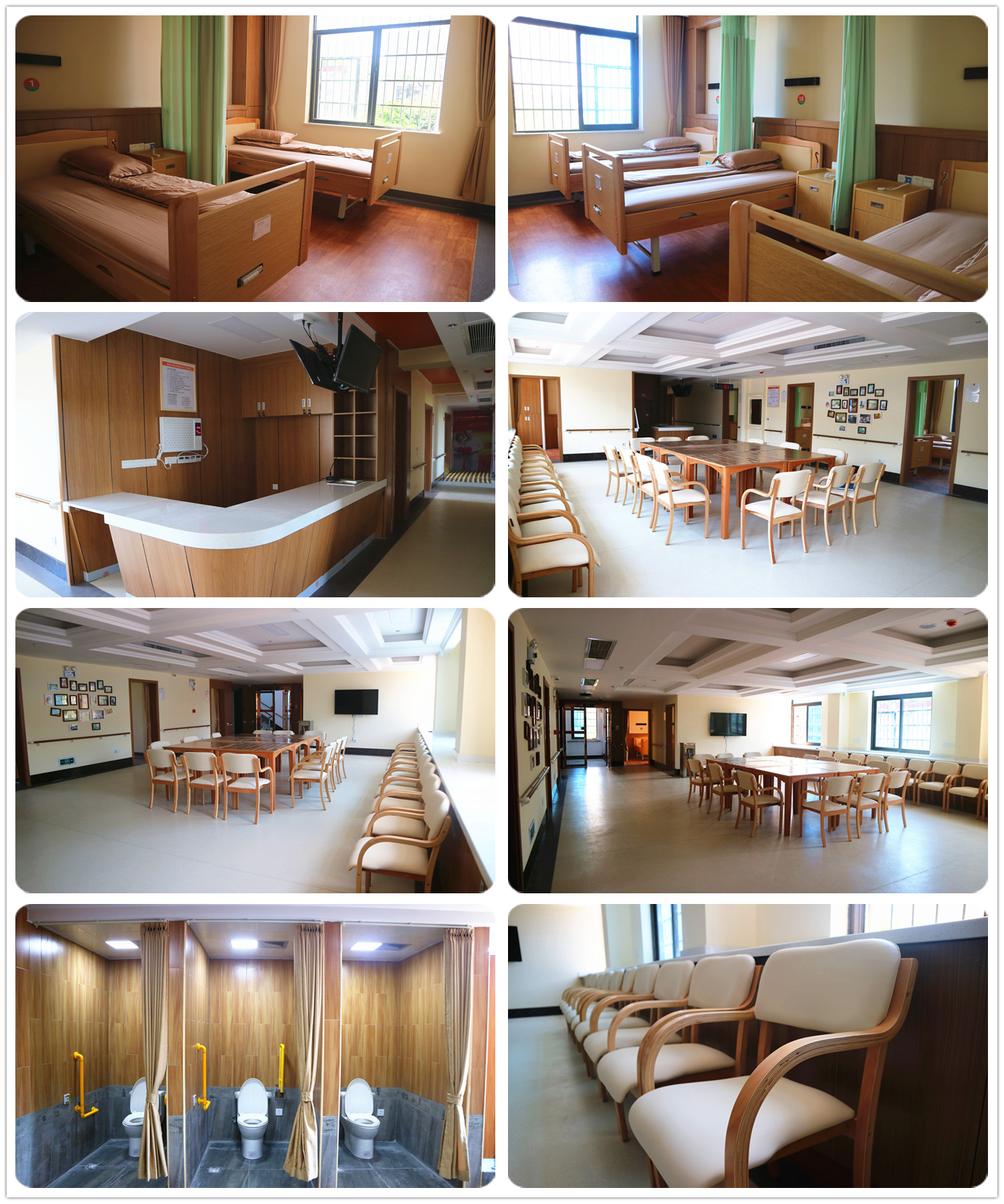 普親開福區老年養護院是普親3.0版本的力作,普親的照護理念是盡可能讓長者減少臥床,長者們每天的大部分時間都會在活動室度過,因而活動室的空間要溫馨舒適,敞亮開闊。在這里我們的社工每天會給長者們量身定制豐富的康復訓練活動,諸如每天的早操、健身操、飯前百步走以及個性化康復訓練巧手拼圖、美工、繪畫類活動等,在這里,每天都有不一樣的快樂。