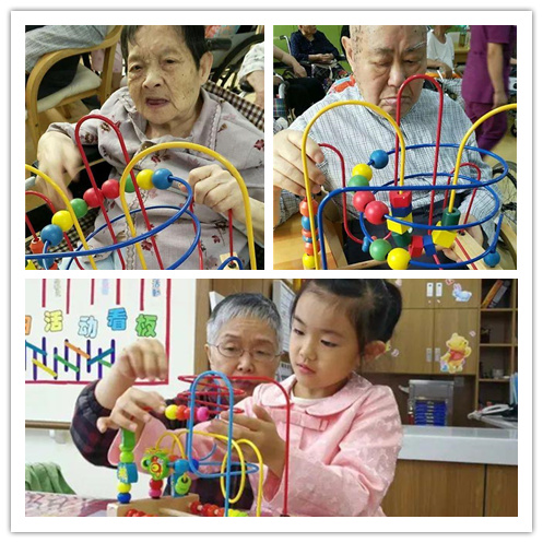 例行的身體檢查結束后,就到了老人們上午的活動時間。有空閑的家屬往往這時候已經來到機構,陪著老人做一些益智健體的游戲,拉著老人嘮嗑,享受珍貴的相處時間。
